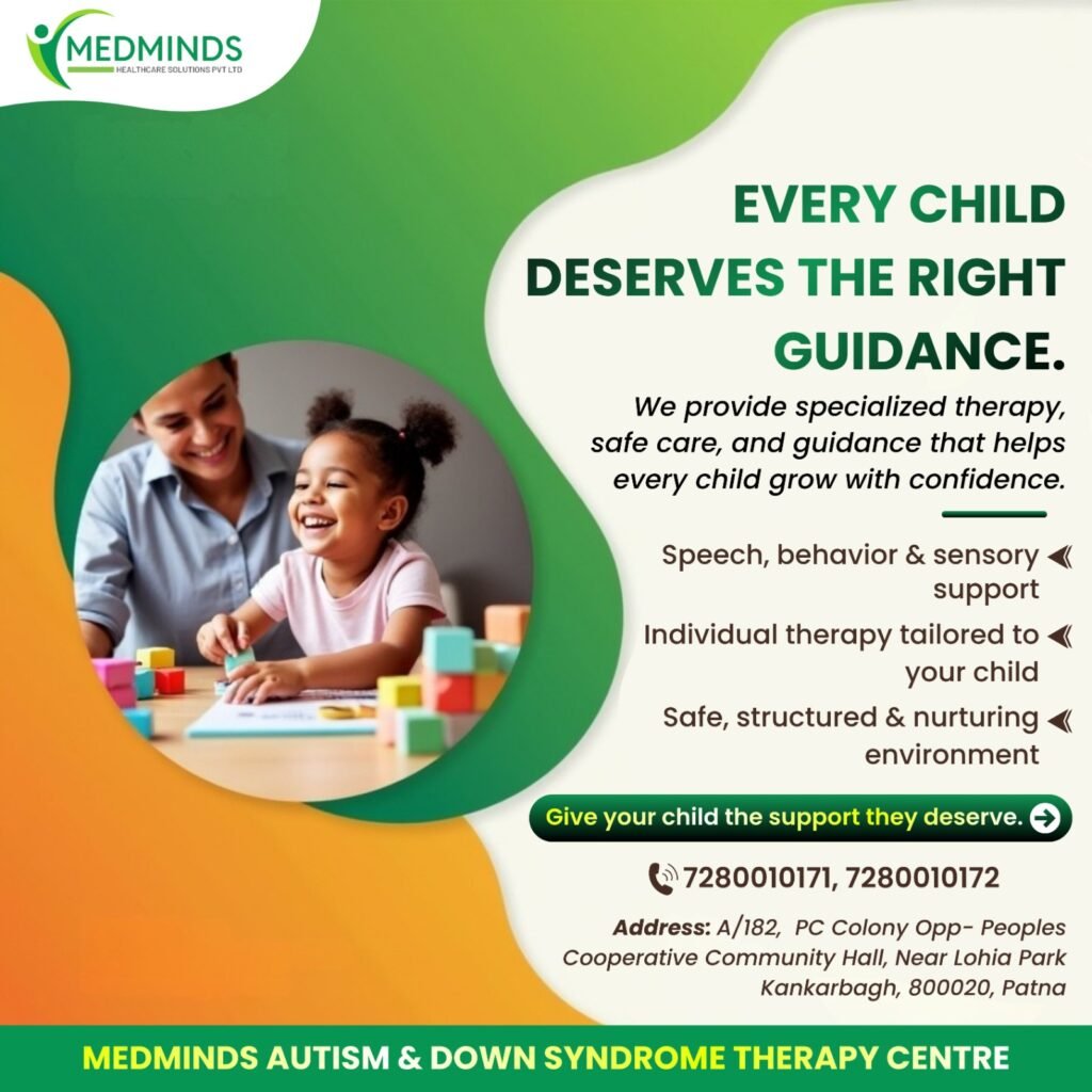 MedMinds Autism & Down Syndrome Therapy Centre provides specialized, child-focused therapy designed to support growth, communication, behavior, sensory development, and essential life skills.
